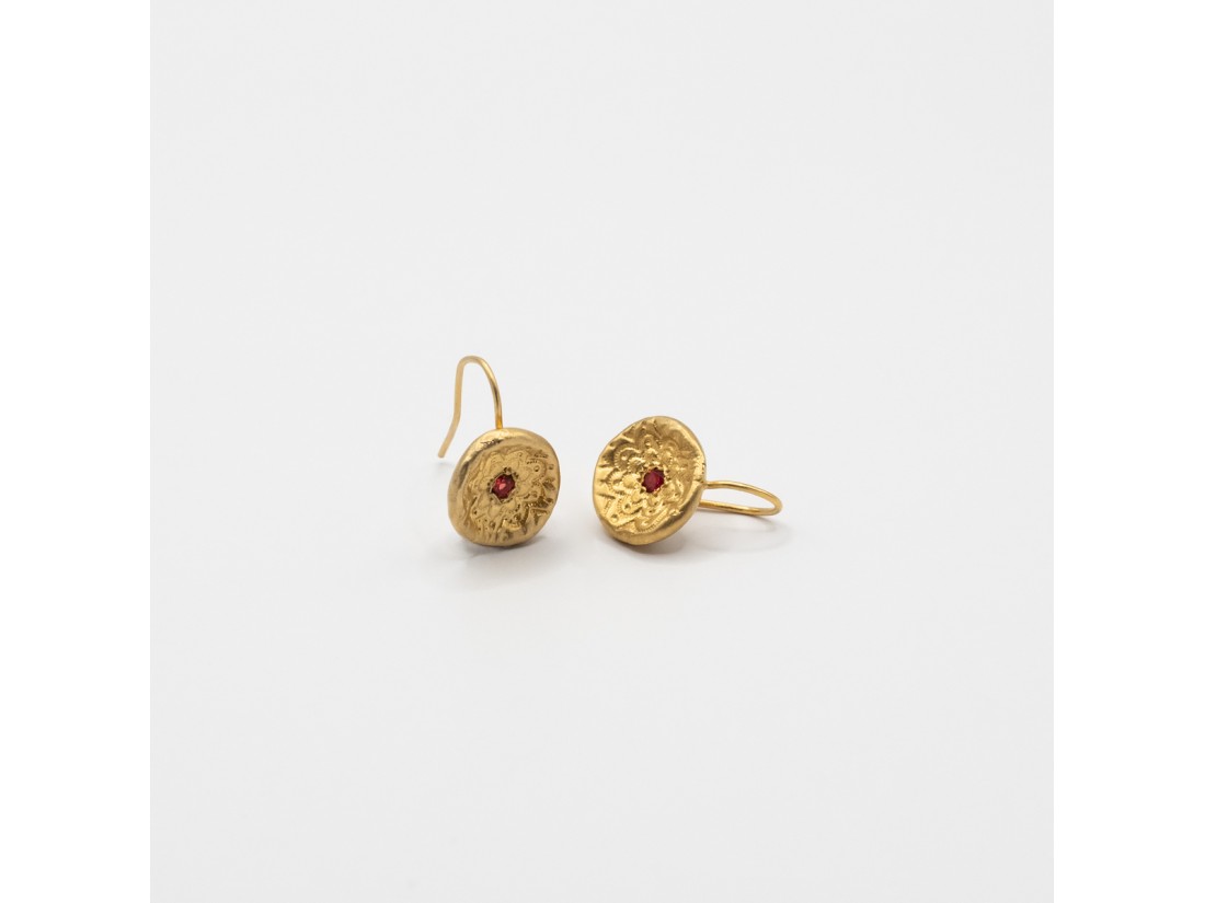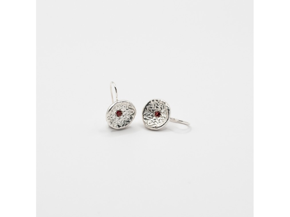 Κρεμαστά σκουλαρίκια, χειροποίητα από ασήμι 925 με φυσική πέτρα γρανάτη. Διάμετρος μοτίβου 1,5 εκατοστά, συνολικό μήκος 2,2 εκατοστά.